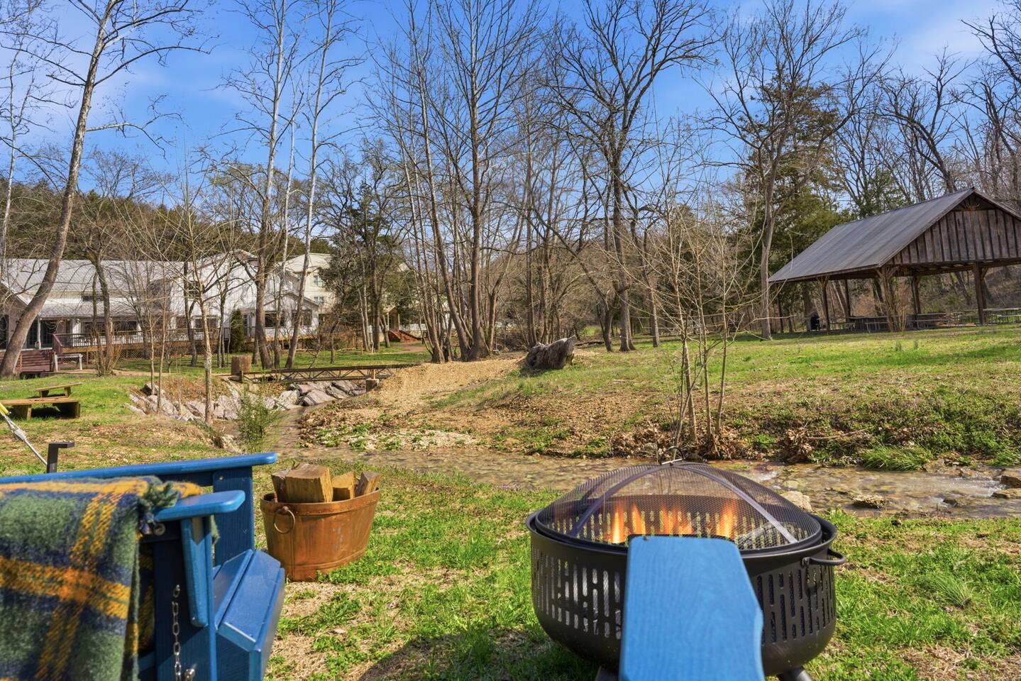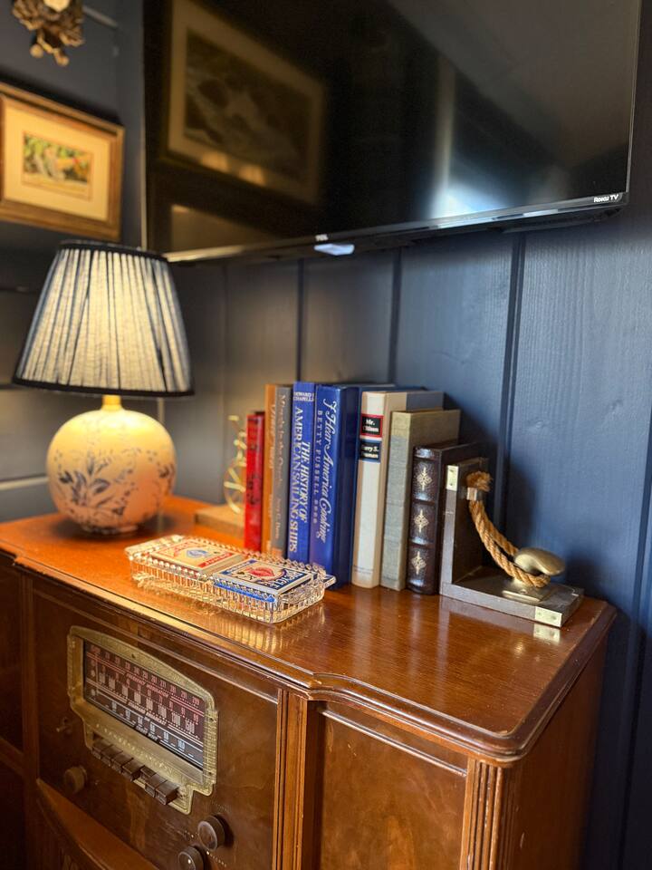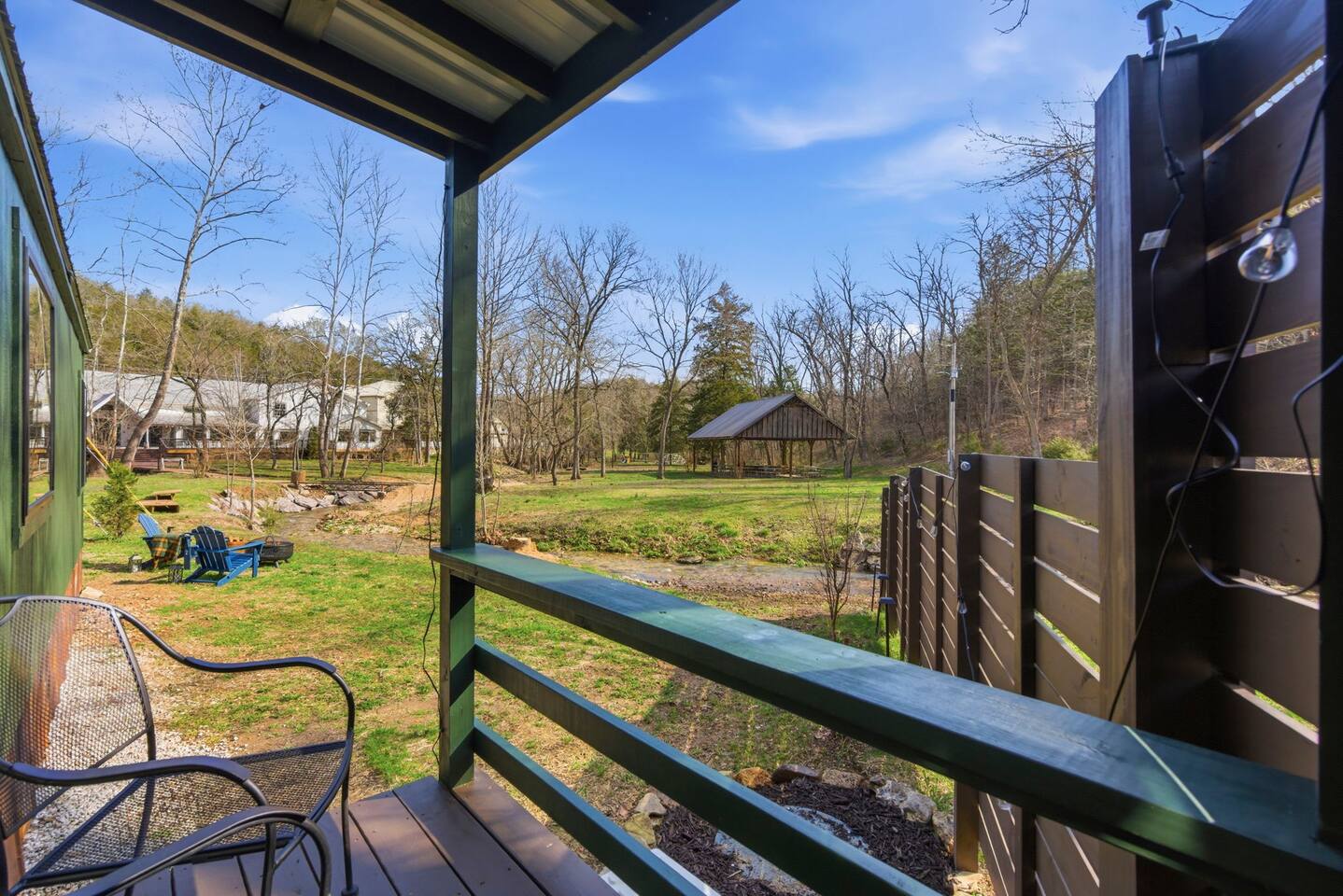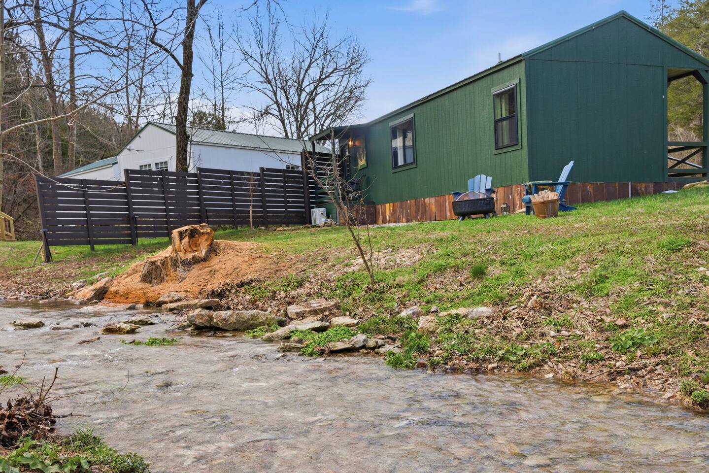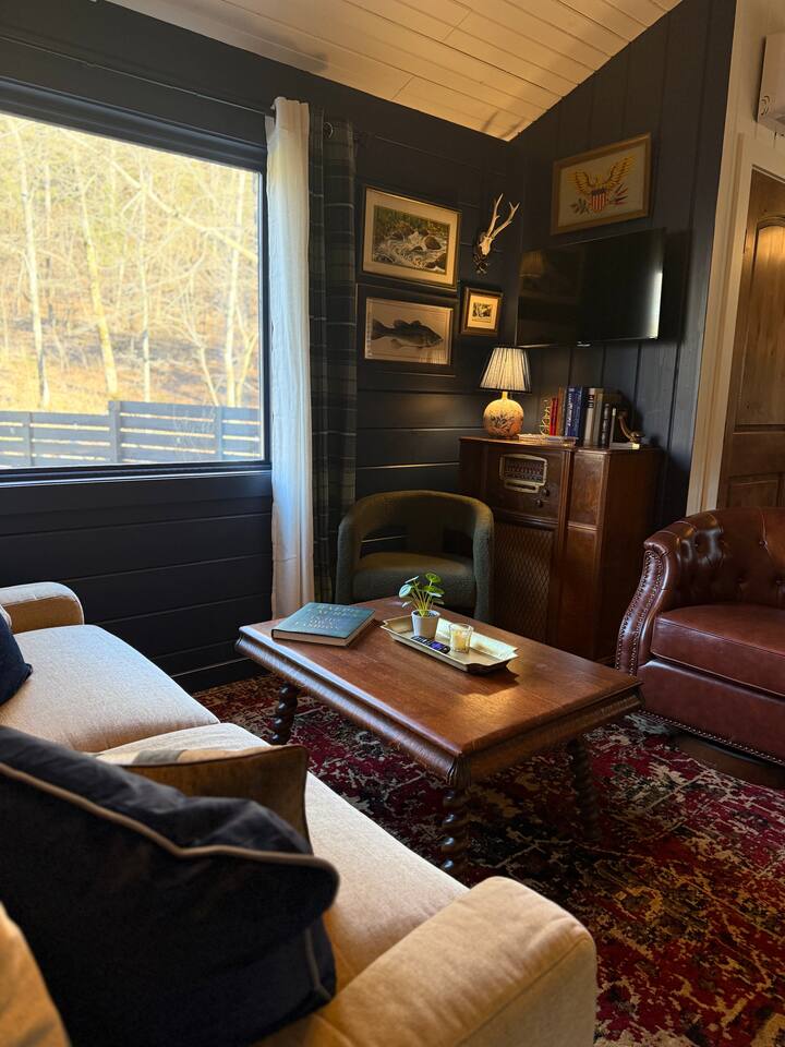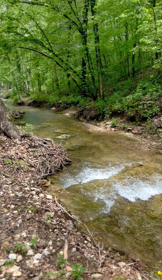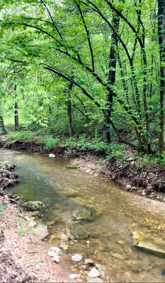 The ultimate weekend getaway in the Ozarks awaits your arrival! You will love the comfort and elegance of this sweet cottage on the creek. A design influence mix of Ralph Lauren Rustic and Nancy Meyers coziness, you will enjoy the relaxed library lounge style living room with comfortable seating, vintage radio, tv, board games, books, puzzles, with a large picture window overlooking the water. There is a sleeper sofa available, but the real treat is the King size suite with comfortable bed, pristine- plush linens, 42" smart t.v., and reading lamps. The bathroom offers a deep soaking tub/shower perfect after a day of hiking in the canyon or outdoor concert. Let us spoil you with fluffy towels, waffle weave bathrobes, toiletries, and Kohler pure warmth seat. The kitchenette provides a full size fridge, small microwave, air-fryer, toaster, and hot plate. Premium Coffee & Tea Bar with drip coffee maker, Keurig, Nespresso machine, bean grinder, frother, electric tea kettle and a variety of coffee & teas. Enjoy the sounds of the creek under the stars by the fire pit, or relax on the front or back porch (both covered)-a wonderful option for sipping tea in the rain and reading a book. Ralphie's Cottage on the Creek offers a private driveway for parking, highspeed internet, and permission to unwind.