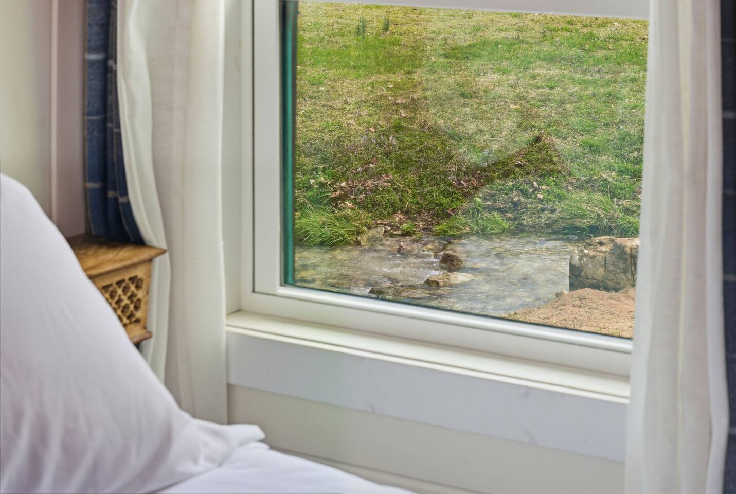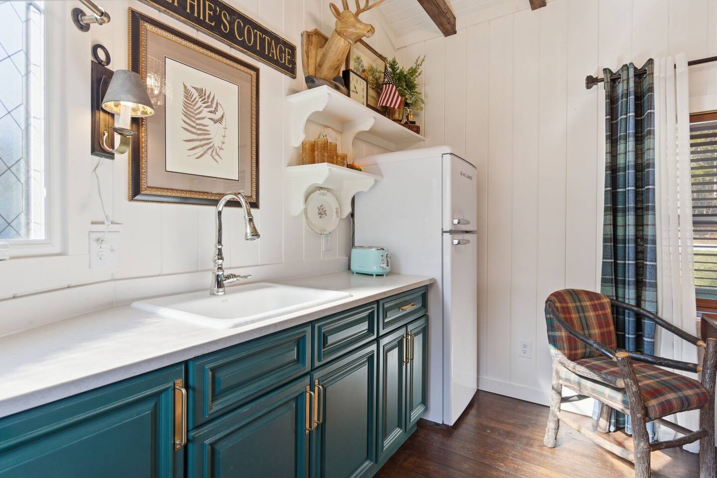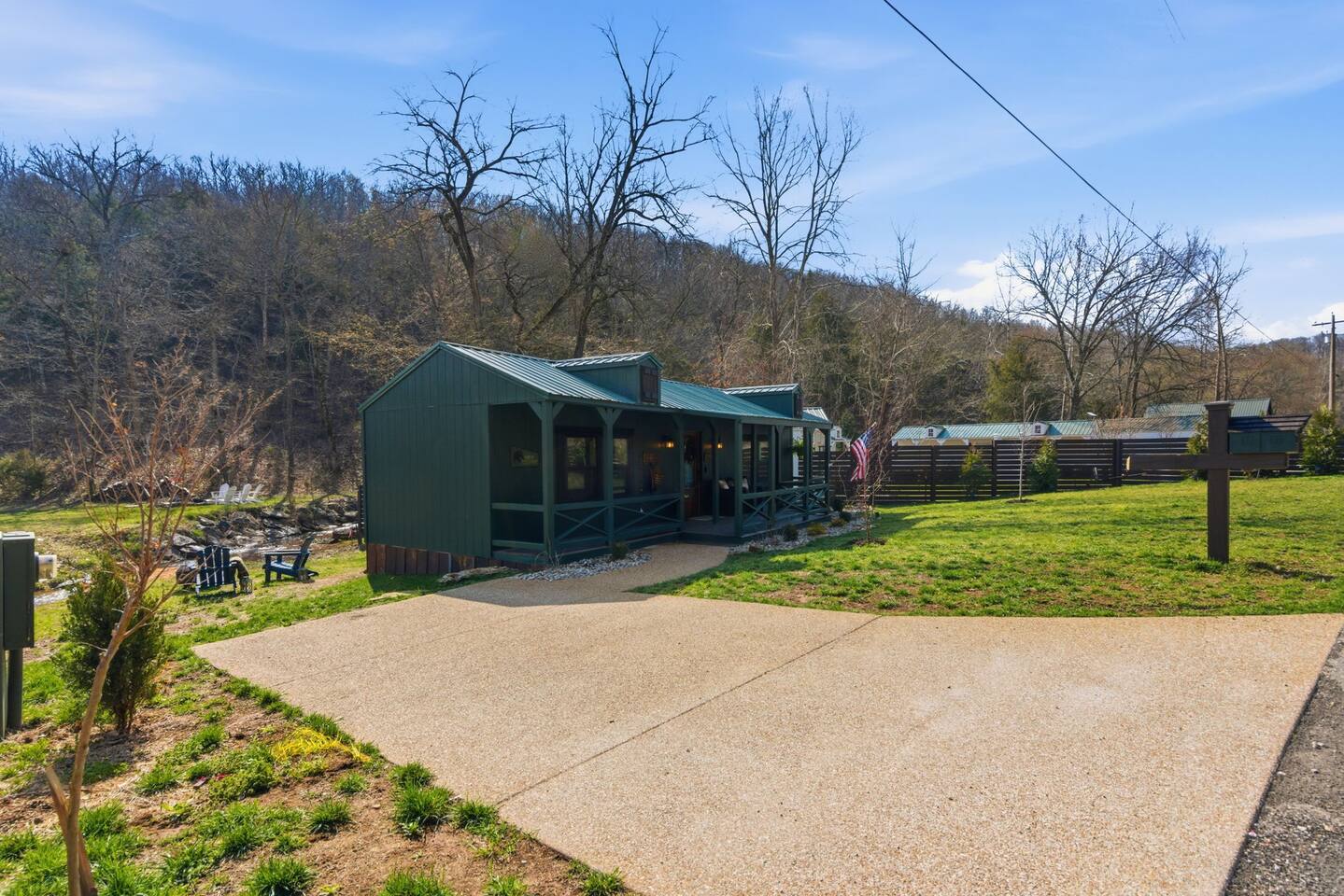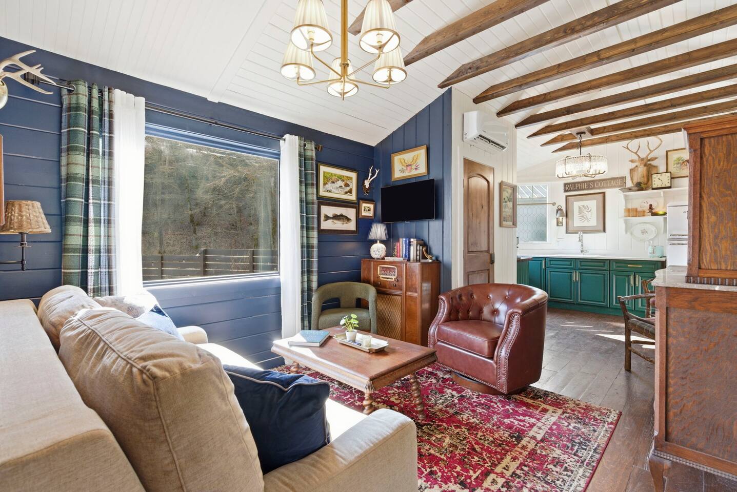 The ultimate weekend getaway in the Ozarks awaits your arrival! You will love the comfort and elegance of this sweet cottage on the creek. A design influence mix of Ralph Lauren Rustic and Nancy Meyers coziness, you will enjoy the relaxed library lounge style living room with comfortable seating, vintage radio, tv, board games, books, puzzles, with a large picture window overlooking the water. There is a sleeper sofa available, but the real treat is the King size suite with comfortable bed, pristine- plush linens, 42" smart t.v., and reading lamps. The bathroom offers a deep soaking tub/shower perfect after a day of hiking in the canyon or outdoor concert. Let us spoil you with fluffy towels, waffle weave bathrobes, toiletries, and Kohler pure warmth seat. The kitchenette provides a full size fridge, small microwave, air-fryer, toaster, and hot plate. Premium Coffee & Tea Bar with drip coffee maker, Keurig, Nespresso machine, bean grinder, frother, electric tea kettle and a variety of coffee & teas. Enjoy the sounds of the creek under the stars by the fire pit, or relax on the front or back porch (both covered)-a wonderful option for sipping tea in the rain and reading a book. Ralphie's Cottage on the Creek offers a private driveway for parking, highspeed internet, and permission to unwind.