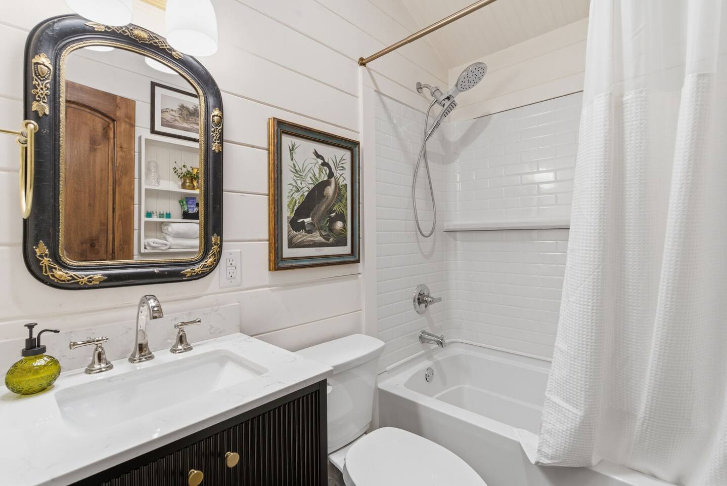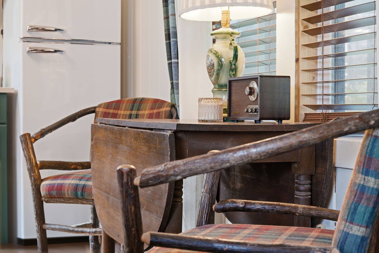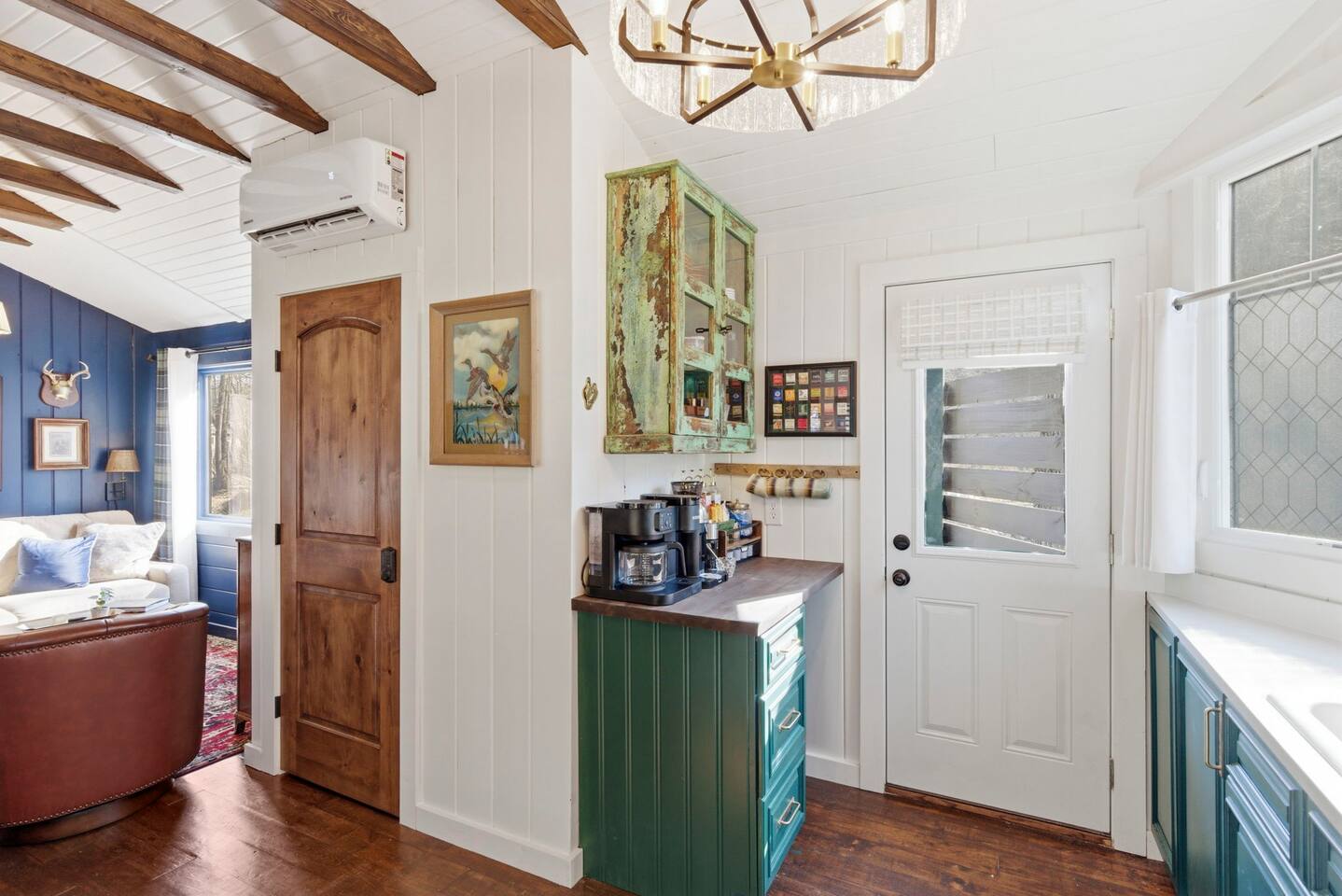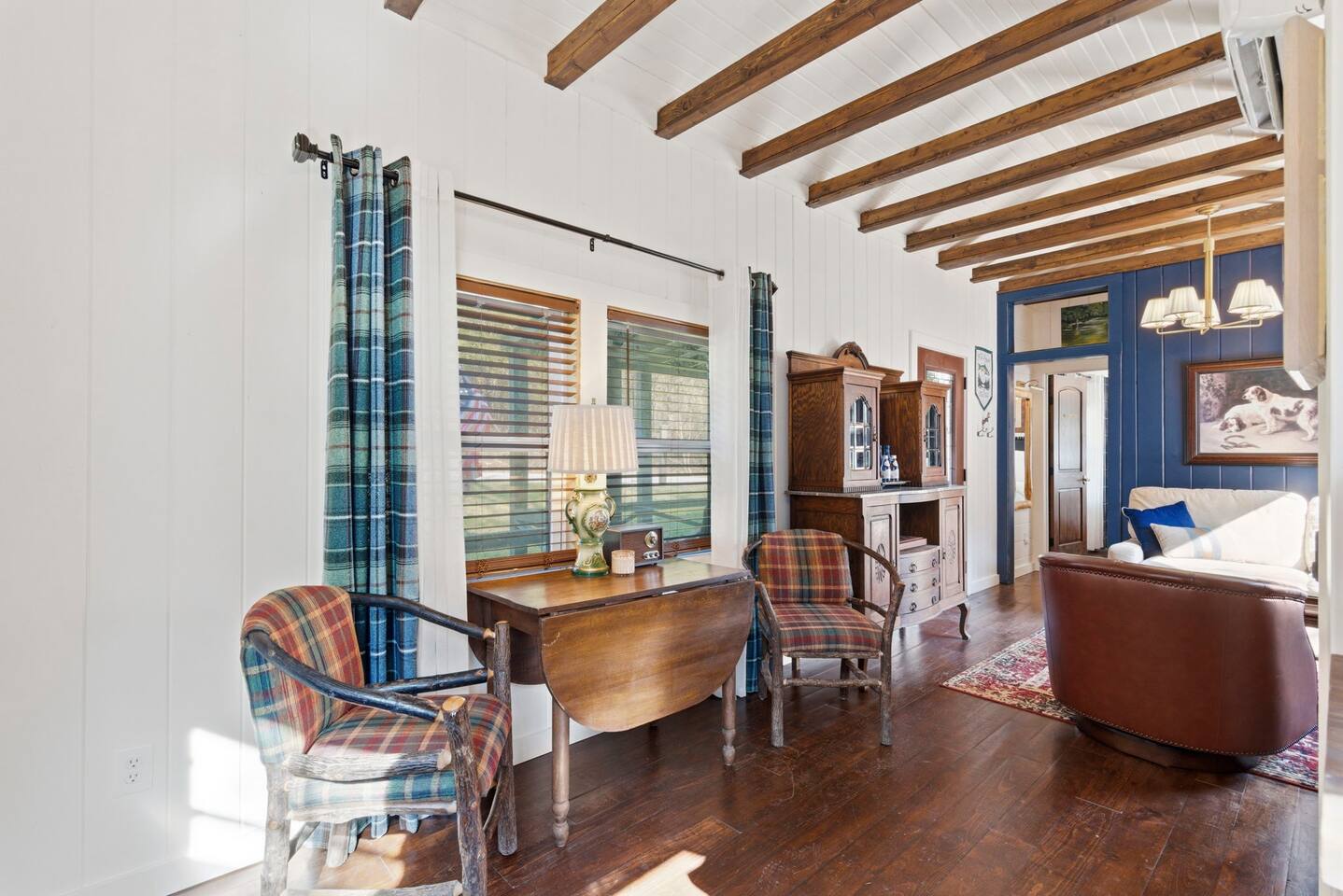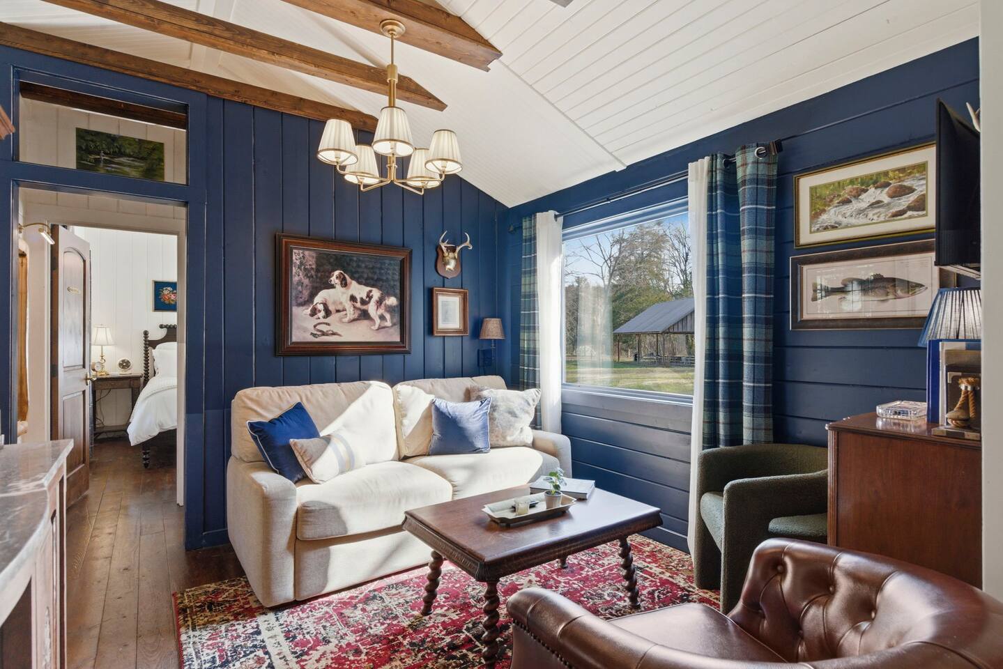The ultimate weekend getaway in the Ozarks awaits your arrival! You will love the comfort and elegance of this sweet cottage on the creek. A design influence mix of Ralph Lauren Rustic and Nancy Meyers coziness, you will enjoy the relaxed library lounge style living room with comfortable seating, vintage radio, tv, board games, books, puzzles, with a large picture window overlooking the water. There is a sleeper sofa available, but the real treat is the King size suite with comfortable bed, pristine- plush linens, 42" smart t.v., and reading lamps. The bathroom offers a deep soaking tub/shower perfect after a day of hiking in the canyon or outdoor concert. Let us spoil you with fluffy towels, waffle weave bathrobes, toiletries, and Kohler pure warmth seat. The kitchenette provides a full size fridge, small microwave, air-fryer, toaster, and hot plate. Premium Coffee & Tea Bar with drip coffee maker, Keurig, Nespresso machine, bean grinder, frother, electric tea kettle and a variety of coffee & teas. Enjoy the sounds of the creek under the stars by the fire pit, or relax on the front or back porch (both covered)-a wonderful option for sipping tea in the rain and reading a book. Ralphie's Cottage on the Creek offers a private driveway for parking, highspeed internet, and permission to unwind.